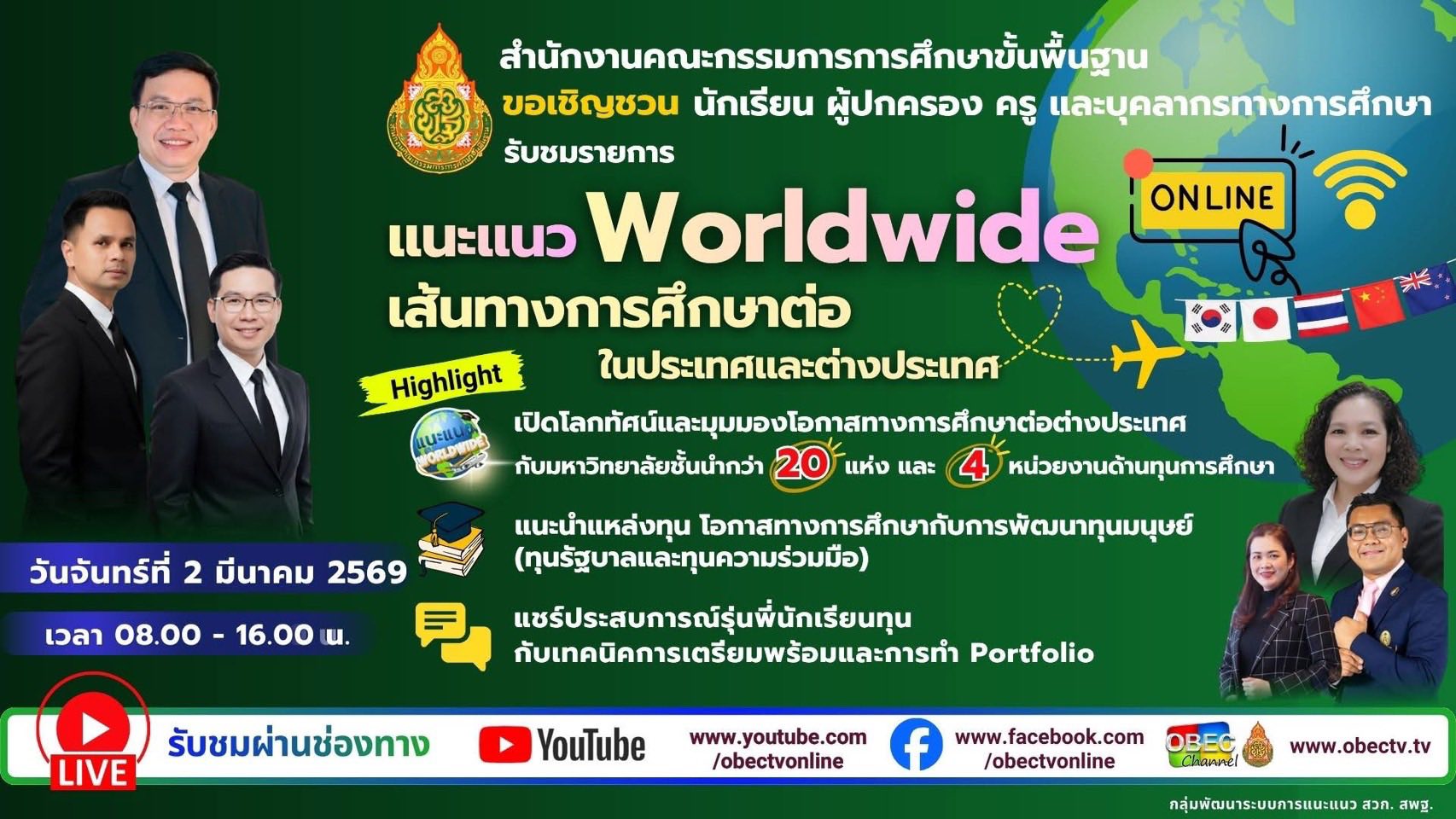 ข่าวสพม.พิจิตร วันที่ 2 มีนาคม 2569 รอง ผอ.สพม.พิจิตร เข้าร่วมรับชมการถ่ายทอดสดรายการ “แนะแนว Worldwide : เส้นทางการศึกษาต่อในประเทศและต่างประเทศ” จัดโดยสำนักงานคณะกรรมการการศึกษาขั้นพื้นฐาน มีวัตถุประสงค์เพื่อ 1. เปิดโลกทัศน์และมุมมองโอกาสทางการศึกษาต่อต่างประเทศ กับมหาวิทยาลัยชั้นนำกว่า 20 แห่ง และ 4 หน่วยงานด้านทุนการศึกษา