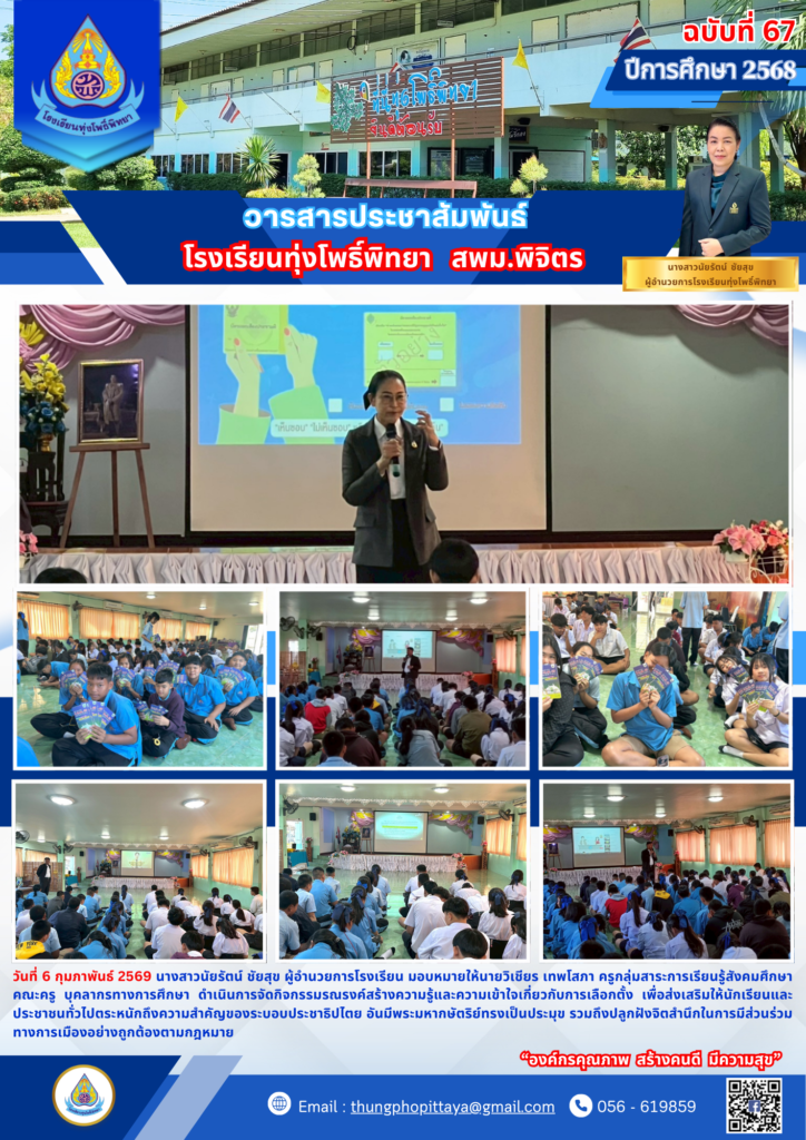 วันที่ 6 กุมภาพันธ์ 2569 นางสาวนัยรัตน์ ชัยสุข ผู้อำนวยการโรงเรียน มอบหมายให้นายวิเชียร เทพโสภา ครูกลุ่มสาระการเรียนรู้สังคมศึกษา คณะครู บุคลากรทางการศึกษา ดำเนินการจัดกิจกรรมรณรงค์สร้างความรู้และความเข้าใจเกี่ยวกับการเลือกตั้ง เพื่อส่งเสริมให้นักเรียนและประชาชนทั่วไปตระหนักถึงความสำคัญของระบอบประชาธิปไตย อันมีพระมหากษัตริย์ทรงเป็นประมุข รวมถึงปลูกฝังจิตสำนึกในการมีส่วนร่วมทางการเมืองอย่างถูกต้องตามกฎหมาย