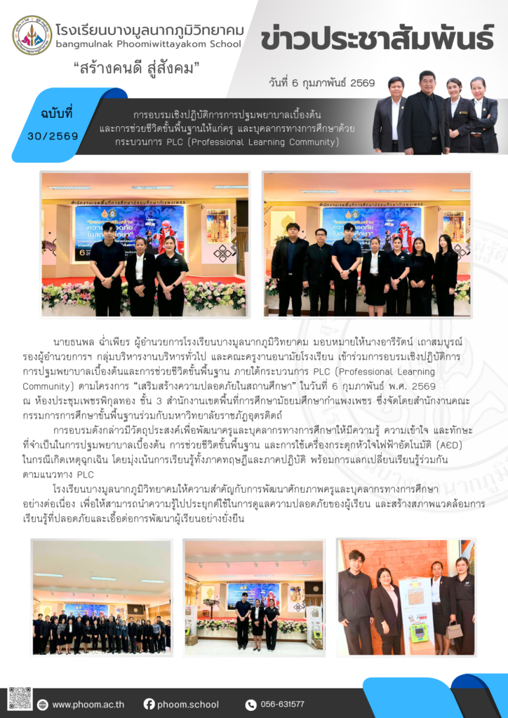 การอบรมเชิงปฏิบัติการการปฐมพยาบาลเบื้องต้น และการช่วยชีวิตขั้นพื้นฐานให้แก่ครู และบุคลากรทางการศึกษาด้วยกระบวนการ PLC (Professional Learning Community)By โรงเรียนบางมูลนากภูมิวิทยาคม / 06/02/2026