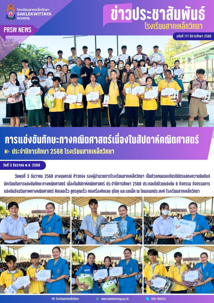 วันพุธที่ 3 ธันวาคม 2568 นางบุษกรณ์ ท้าวทอง รองผู้อำนวยการโรงเรียนสากเหล็กวิทยา เป็นตัวแทนมอบเกียรติบัตรแสดงความยินดีแก่นักเรียนในการแข่งขันทักษะทางคณิตศาสตร์ เนื่องในสัปดาห์คณิตศาสตร์ ประจำปีการศึกษา 2568 ประกอบไปด้วยแข่งขัน 6 กิจกรรม กิจกรรมการแข่งขันอัจฉริยภาพทางคณิตศาสตร์ คิดเลขเร็ว สูตรคูณเร็ว กดเครื่องคิดเลข ซุโดกุ และเอแม็ท ณ โดมอเนกประสงค์ โรงเรียนสากเหล็กวิทยา