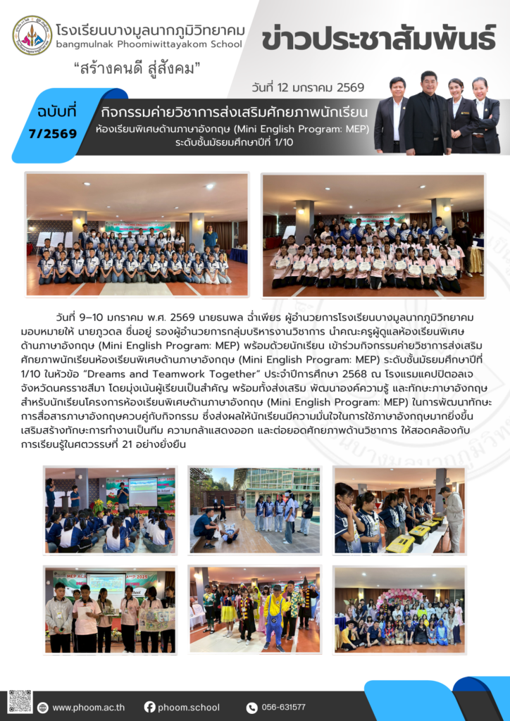 กิจกรรมค่ายวิชาการส่งเสริมศักยภาพนักเรียนห้องเรียนพิเศษด้านภาษาอังกฤษ (Mini English Program: MEP) ระดับชั้นมัธยมศึกษาปีที่ 1/10