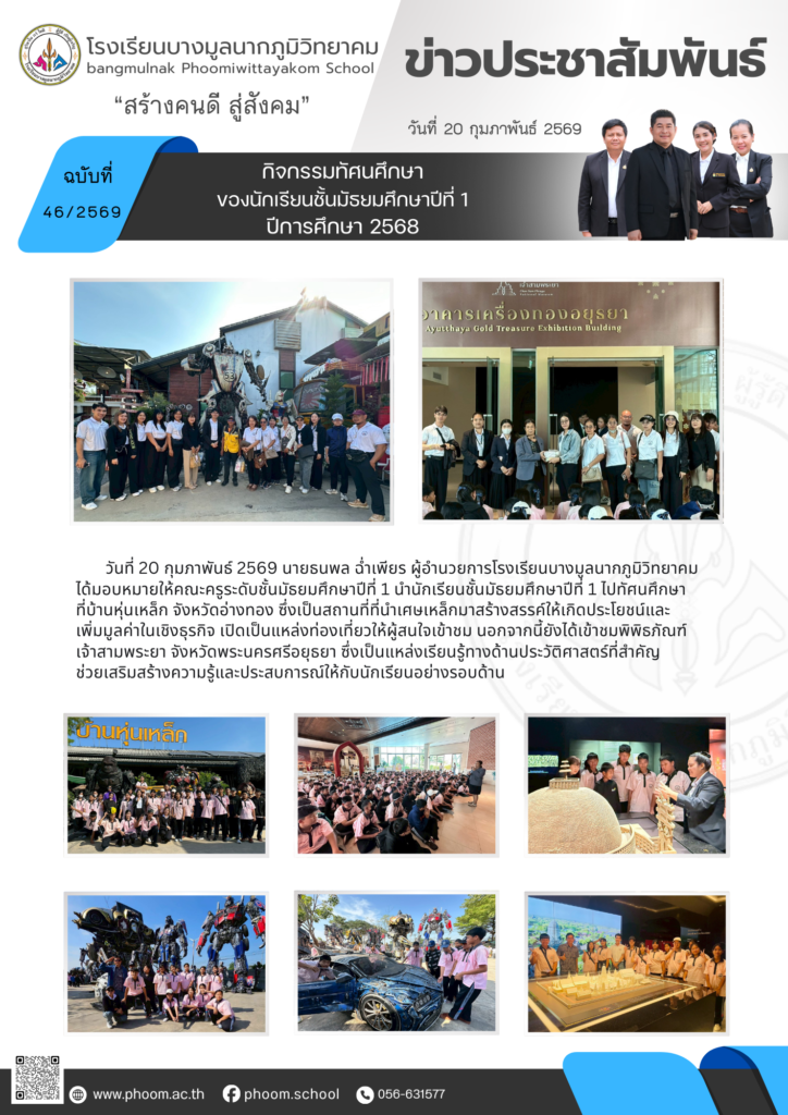 กิจกรรมทัศนศึกษาของนักเรียนชั้นมัธยมศึกษาปีที่ 1 ปีการศึกษา 2568By โรงเรียนบางมูลนากภูมิวิทยาคม / 06/03/2026