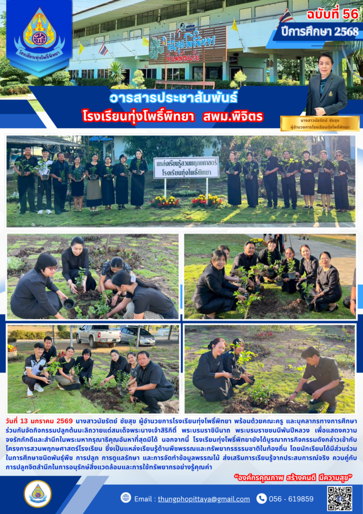 วันที่ 13 มกราคม 2569 นางสาวนัยรัตย์ ชัยสุข ผู้อำนวยการโรงเรียนทุ่งโพธิ์พิทยา พร้อมด้วยคณะครู และบุคลากรทางการศึกษา ร่วมกันจัดกิจกรรมปลูกต้นมะลิถวายแด่สมเด็จพระนางเจ้าสิริกิติ์ พระบรมราชินีนาถ พระบรมราชชนนีพันปีหลวง เพื่อแสดงความจงรักภักดีและสำนึกในพระมหากรุณาธิคุณอันหาที่สุดมิได้ นอกจากนี้ โรงเรียนทุ่งโพธิ์พิทยายังได้บูรณาการกิจกรรมดังกล่าวเข้ากับโครงการสวนพฤกษศาสตร์โรงเรียน ซึ่งเป็นแหล่งเรียนรู้ด้านพืชพรรณและทรัพยากรธรรมชาติในท้องถิ่น โดยนักเรียนได้มีส่วนร่วมในการศึกษาชนิดพันธุ์พืช การปลูก การดูแลรักษา และการจัดทำข้อมูลพรรณไม้ ส่งเสริมการเรียนรู้จากประสบการณ์จริง ควบคู่กับการปลูกจิตสำนึกในการอนุรักษ์สิ่งแวดล้อมและการใช้ทรัพยากรอย่างรู้คุณค่า