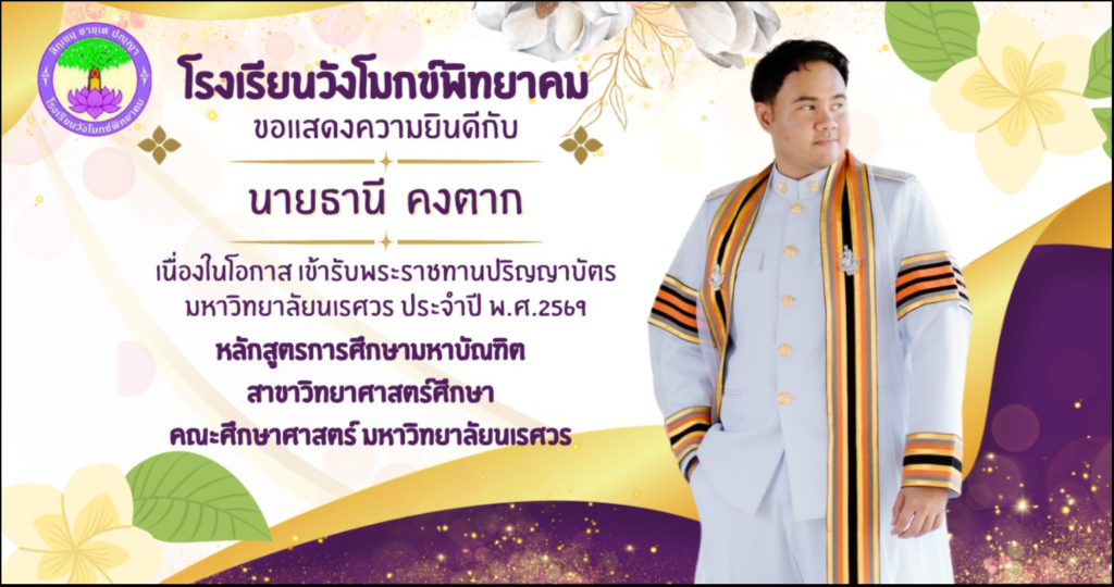 โรงเรียนวังโมกข์พิทยาคม ขอแสดงความยินดีกับครูธานี คงตาก ครูกลุ่มสาระการเรียนรู้วิทยาศาสตร์และเทคโนโลยี เนื่องในโอกาสสำเร็จการศึกษาระดับปริญญาโท สาขาวิทยาศาสตร์ศึกษา คณะศึกษาศาสตร์ มหาวิทยาลัยนเรศวร