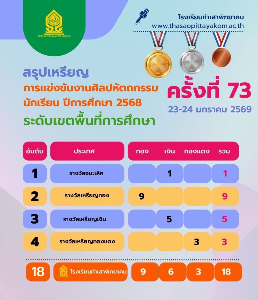 ฝ่ายบริหารและฝ่ายวิชาการ ขอแสดงความยินดีกับคณะครูผู้ฝึกซ้อมและนักเรียนคนเก่งโรงเรียนท่าเสาพิทยาคมทุกท่าน ที่ได้เป็นตัวแทนเข้าร่วมการแข่งขันและสร้างชื่อเสียงให้กับโรงเรียนของเรา โดยมีผลการแข่งขันที่น่าภาคภูมิใจ ดังนี้