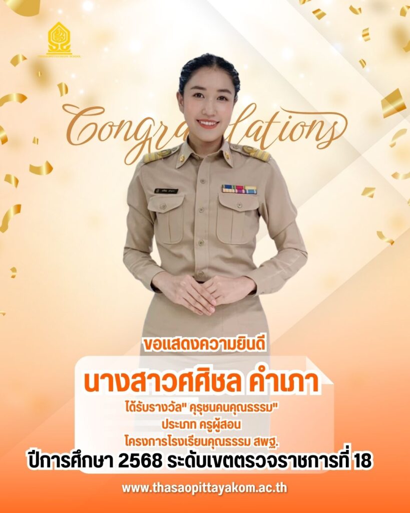 ขอแสดงความยินดีกับ นางสาวศศิชล คำเภา ที่ได้รับรางวัล” คุรุชนคนคุณธรรม” ด้านการจัดการเรียนการสอน โครงการโรงเรียนคุณธรรม สพฐ. ปีการศึกษา 2568 ระดับเขตตรวจราชการที่ 18