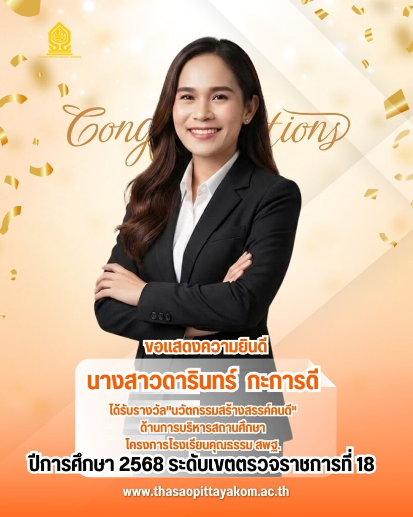 ขอแสดงความยินดีกับ นางสาวดารินทร์ กะการดี รองผู้อำนวยการชำนาญการพิเศษ ที่ได้รับรางวัล”นวัตกรรมสร้างสรรค์คนดี”