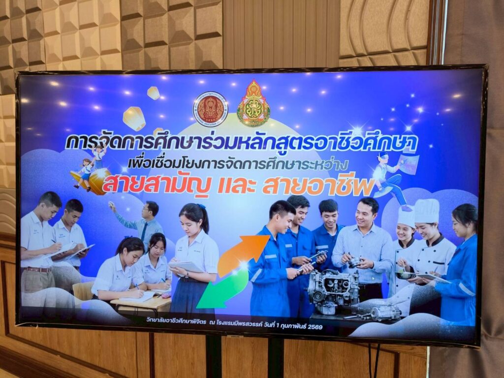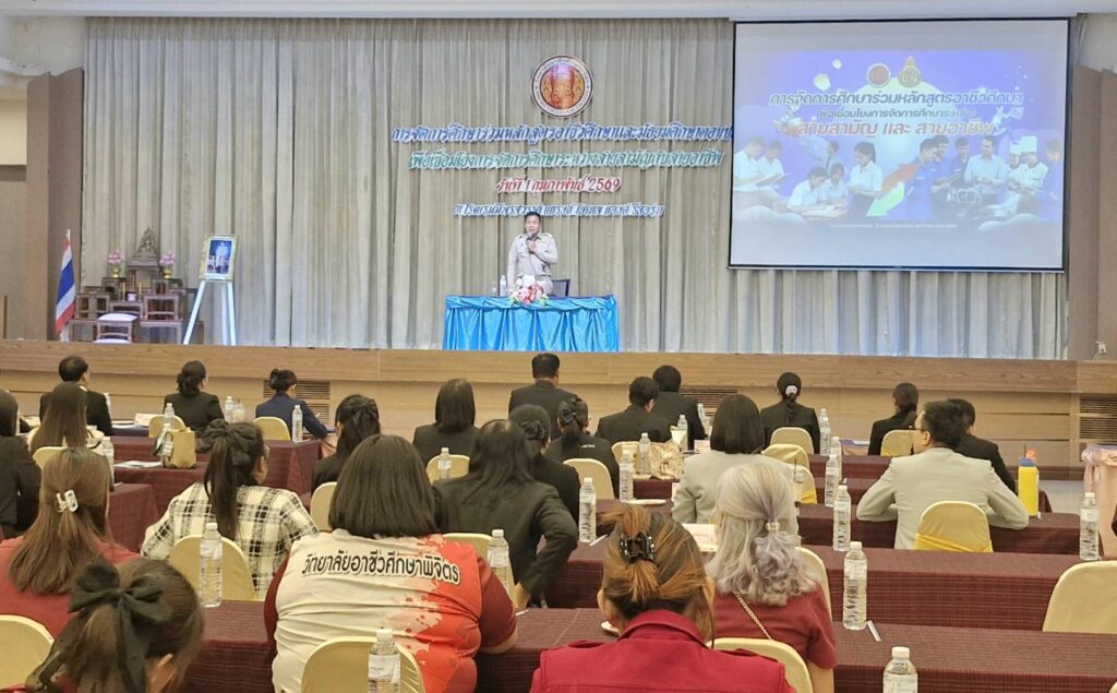 วันอาทิตย์ที่ 2 มีนาคม พ.ศ.2568 ดร.สิงห์เพชร สุทธิ ผู้อำนวยการสำนักงานเขตพื้นที่การศึกษามัธยมศึกษาพิจิตร มอบหมายให้นางยุพร เหลืองศรีสกุล ผู้อำนวยการกลุ่มบริหารงานบุคคล และบุคลกรในสังกัด เข้าร่วมการประชุมแนวทางการจัดการเรียนร่วมหลักสูตรอาชีวศึกษาและมัธยมศึกษาตอนปลาย (ทวิศึกษา) เพื่อขานรับนโยบายกระทรวงศึกษาธิการในการยกระดับคุณภาพผู้เรียนให้มีทักษะวิชาชีพควบคู่ไปกับสายสามัญ มุ่งเน้นการผลิตกำลังคนที่ตอบโจทย์ความต้องการของตลาดแรงงานในปัจจุบัน โดยมีนายธนิต ภูมิถาวร รองผู้ว่าราชการจังหวัดพิจิตร เป็นประธานในพิธีเปิดการอบรม และนายประเสริฐ วงศ์โปธา ผู้อำนวยการวิทยาลัยอาชีวศึกษาพิจิตร พร้อมด้วยคณะผู้บริหารสถานศึกษา และบุคลากรทางการศึกษาเข้าร่วมการประชุม ณ ห้องประชุมจินดารัตน์ โรงแรมมีพรสวรรค์ แกรนด์โฮเทล แอนด์รีสอร์ท อำเภอเมืองพิจิตร จังหวัดพิจิตร
