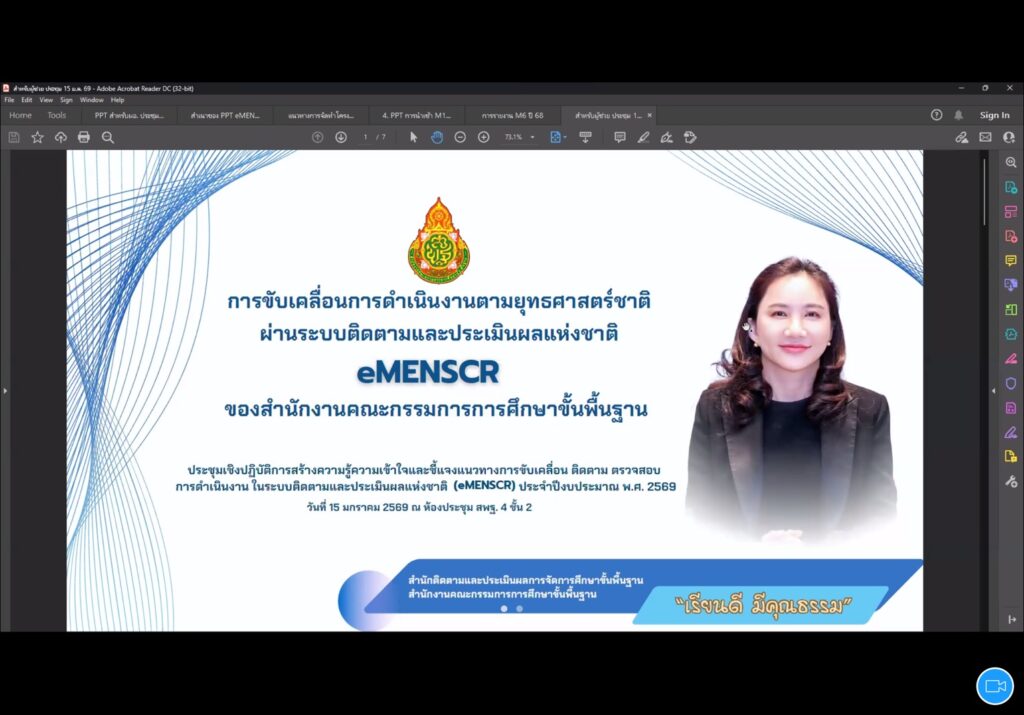วันที่ 15 มกราคม 2569 ดร.สิงห์เพชร สุทธิ ผู้อำนวยการสำนักงานเขตพื้นที่การศึกษามัธยมศึกษาพิจิตร มอบหมายให้กลุ่มนโยบายและแผน เข้าร่วมการประชุมเชิงปฏิบัติการสร้างความรู้ความเข้าใจ และชี้แจงแนวทาง การขับเคลื่อนติดตามตรวจสอบการดำเนินงานในระบบติดตามและประเมินผลแห่งชาติ (eMENSCR) ประจำปีงบประมาณ พ.ศ. 2569 ผ่านระบบออนไลน์ Zoom Meeting เพื่อขับเคลื่อนการดำเนินงานการนำเข้าข้อมูลโครงการ (M1 – M5) และการรายงานความก้าวหน้าโครงการ (M6) ในระบบติดตามและประเมินผลแห่งชาติ (eMENSCR) ณ ห้องประชุมเพชรพิจิตร สำนักงานเขตพื้นที่การศึกษามัธยมศึกษาพิจิตร อำเภอเมือง จังหวัดพิจิตร