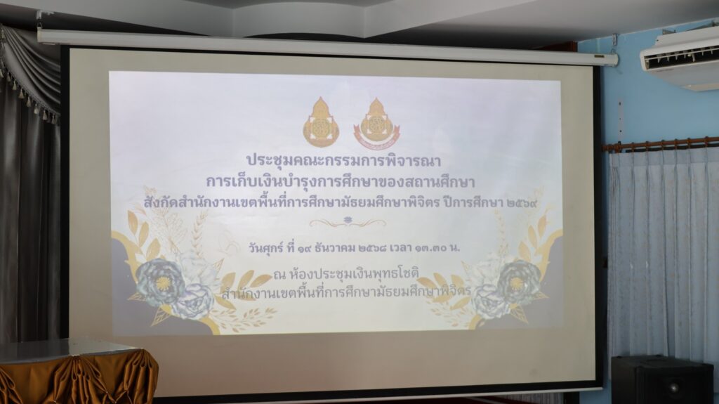 วันที่ 19 ธันวาคม 2568 ดร.สิงห์เพชร สุทธิ ผู้อำนวยการสำนักงานเขตพื้นที่การศึกษามัธยมศึกษาพิจิตร ประธานการประชุมคณะกรรมการพิจารณาการเก็บเงินบำรุงการศึกษาของสถานศึกษา สังกัดสำนักงานเขตพื้นที่การศึกษามัธยมศึกษาพิจิตร โดยมี นางสาวนิรัติศัย สิทธิรักษ์ รองผู้อำนวยการสำนักงานเขตพื้นที่การศึกษามัธยมศึกษาพิจิตร พร้อมด้วยคณะกรรมการและผู้เกี่ยวข้องเข้าร่วมการประชุม