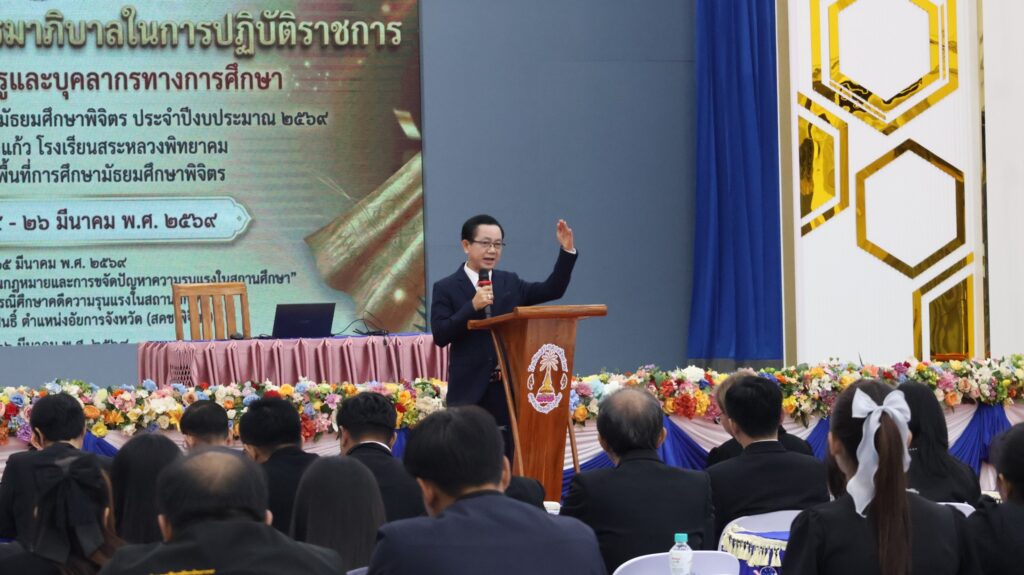 วันที่ 24 มีนาคม 2569 ดร.สิงห์เพชร สุทธิ ผู้อำนวยการสำนักงานเขตพื้นที่การศึกษามัธยมศึกษาพิจิตร พร้อมด้วย นายวณัฐพงศ์ ทองคำ รองผู้อำนวยการสำนักงานเขตพื้นที่การศึกษามัธยมศึกษาพิจิตร ดำเนินการจัดอบรมเสริมสร้างธรรมาภิบาลในการปฏิบัติราชการสำหรับข้าราชการครูและบุคลากรทางศึกษา สังกัดสำนักงานเขตพื้นที่การศึกษามัธยมศึกษาพิจิตร ประจำปีงบประมาณ 2569 ระหว่างวันที่ 25 – 26 มีนาคม 2569 ณ หอประชุมคุ้มดอกแก้ว โรงเรียนสระหลวงพิทยาคม เพื่อสร้างความรู้ความเข้าใจหลักกฎหมายที่ถูกต้อง ตามกฎหมาย กฎระเบียบ ข้อบังคับ ที่เกี่ยวข้องกับการปฏิบัติหน้าที่ราชการ และเสริมสร้างการมีวินัย รักษาจรรยาบรรณ สร้างเสริมคุณธรรม จริยธรรม และธรรมาภิบาลในสถานศึกษา โดยได้รับเกียรติจาก นายประเสริฐ ใจสนธิ์ อัยการจังหวัด ประจำสำนักงานอัยการสูงสุด สำนักงานอัยการคุ้มครองสิทธิและช่วยเหลือทางกฎหมายและการบังคับคดีจังหวัดพิจิตร (สคช.พิจิตร) และ นายคะนึง จันทร์สงเคราะห์ ตุลาการหัวหน้าคณะศาลปกครองนครสวรรค์ ให้การบรรยายในการอบรมนี้