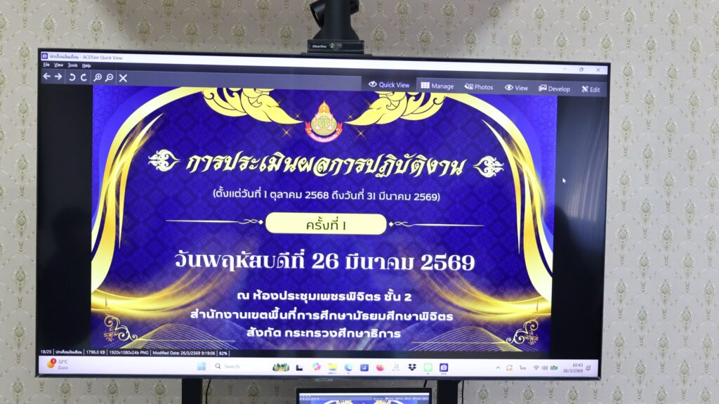 ข่าวสพม.พิจิตร วันที่ 26 มีนาคม 2569 – ผอ.สพม.พิจิตร ประธานการประเมินผลการปฏิบัติงาน ตำแหน่งบุคลากรทางการศึกษาอื่น ตามมาตรา ๓๘ ค. (๒) และพนักงานราชการ ประจำปีงบประมาณ พ.ศ. ๒๕๖9 ครั้งที่ 1 (ตั้งแต่วันที่ 1 ตุลาคม 2568 ถึงวันที่ 31 มีนาคม 2569) โดยมีนายวณัฐพงศ์ ทองคำ รองผู้อำนวยการสำนักงานเขตพื้นที่การศึกษามัธยมศึกษาพิจิตร คณะกรรมการประเมินในครั้งนี้ ณ ห้องประชุมเพชรพิจิตร สพม.พิจิตร
