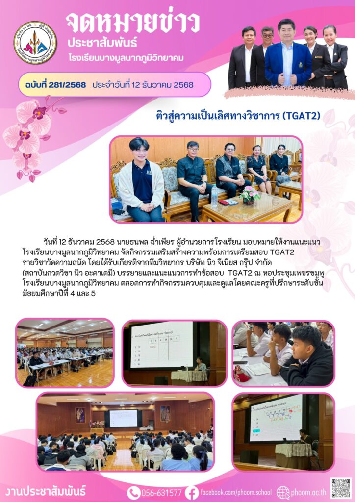 งานแนะแนวโรงเรียนบางมูลนากภูมิวิทยาคม จัดกิจกรรมเสริมสร้างความพร้อมการเตรียมสอบ TGAT2 รายวิชาวัดความถนัดBy โรงเรียนบางมูลนากภูมิวิทยาคม / 12/12/2025