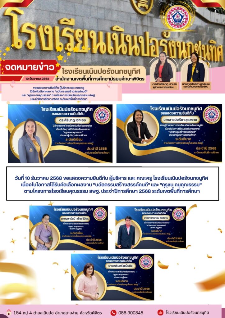จดหมายข่าวประชาสัมพันธ์โรงเรียนเนินปอรังนกชนูทิศ ขอแสดงความยินดีกับ ผู้บริหาร และ คณะครู โรงเรียนเนินปอรังนกชนูทิศ เนื่องในโกาสได้รับคัดเลือกผลงาน “นวัตกรรมสร้างสรรค์คนดี” และ “คุรุชน คนคุณธรรม” ตามโครงการโรงเรียนคุณธรรม สพฐ. ประจำปีการศึกษา 2568 ระดับเขตพื้นที่การศึกษา