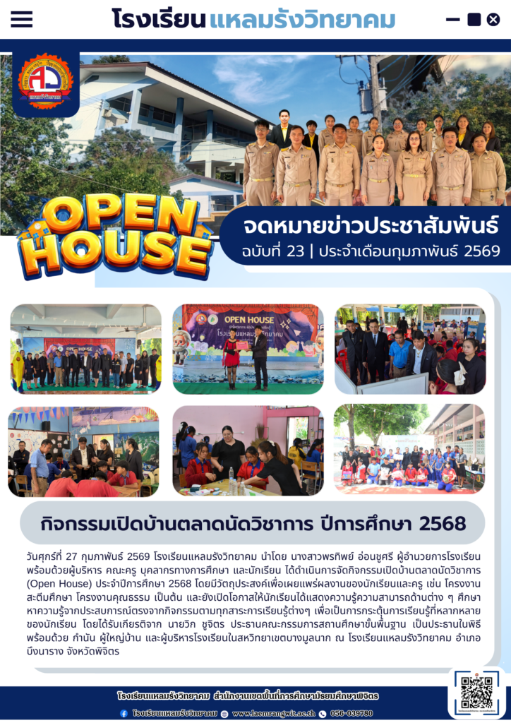จดหมายข่าวโรงเรียนแหลมรังวิทยาคม ประจำเดือนกุมภาพันธ์ ฉบับที่ 23/2569 วันที่ 1 มีนาคม 2569By pr1066350400 / 01/03/2026