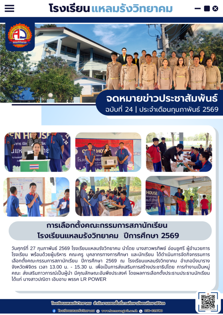 จดหมายข่าวโรงเรียนแหลมรังวิทยาคม ประจำเดือนกุมภาพันธ์ ฉบับที่ 24/2569 วันที่ 1 มีนาคม 2569By pr1066350400 / 01/03/2026