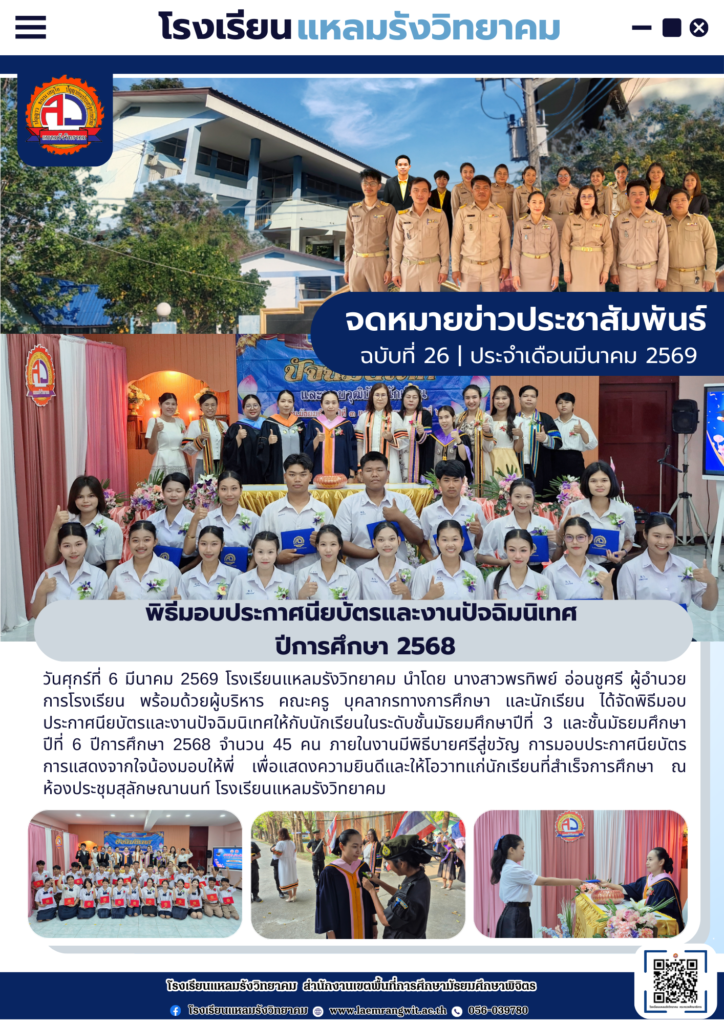 จดหมายข่าวโรงเรียนแหลมรังวิทยาคม ประจำเดือนมีนาคม ฉบับที่ 26/2569 วันที่ 9 มีนาคม 2569By pr1066350400 / 09/03/2026
