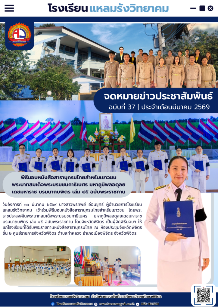จดหมายข่าวโรงเรียนแหลมรังวิทยาคม ประจำเดือนมีนาคม ฉบับที่ 37/2569 วันที่ 31 มีนาคม 2569By pr1066350400 / 31/03/2026