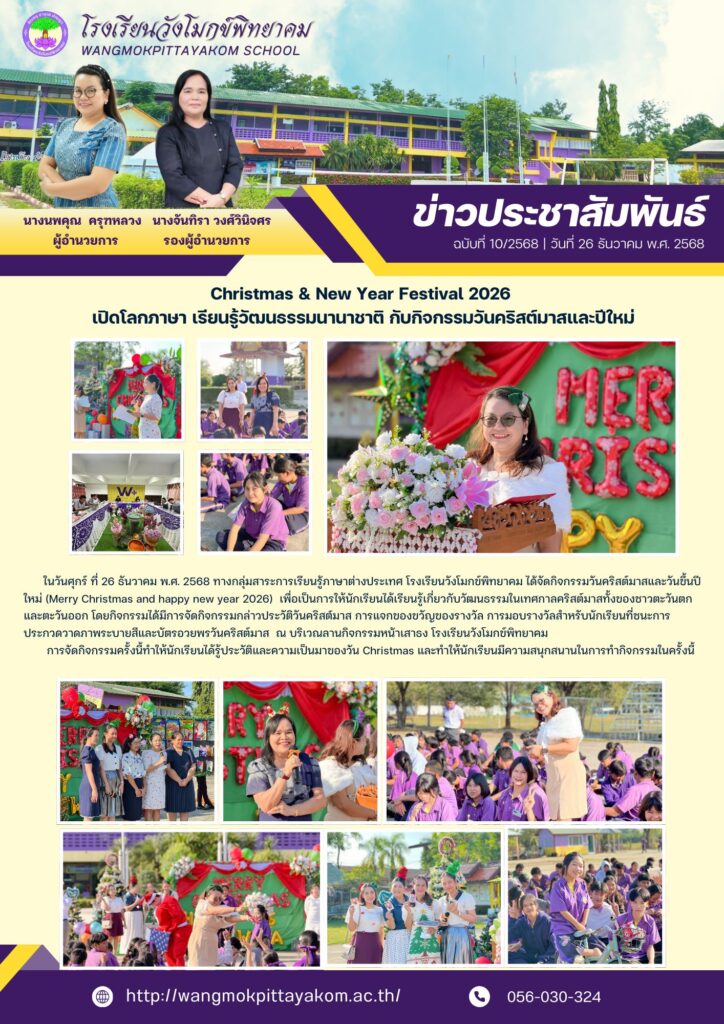 ในวันศุกร์ ที่ 26 ธันวาคม พ.ศ. 2568 ทางกลุ่มสาระการเรียนรู้ภาษาต่างประเทศ โรงเรียนวังโมกข์พิทยาคม ได้จัดกิจกรรมวันคริสต์มาสและวันขึ้นปีใหม่ (Merry Christmas and happy new year 2026) เพื่อเป็นการให้นักเรียนได้เรียนรู้เกี่ยวกับวัฒนธรรมในเทศกาลคริสต์มาสทั้งของชาวตะวันตกและตะวันออก โดยกิจกรรมได้มีการจัดกิจกรรมกล่าวประวัติวันคริสต์มาส การแจกของขวัญของรางวัล การมอบรางวัลสำหรับนักเรียนที่ชนะการประกวดวาดภาพระบายสีและบัตรอวยพรวันคริสต์มาส ณ บริเวณลานกิจกรรมหน้าเสาธง โรงเรียนวังโมกข์พิทยาคม