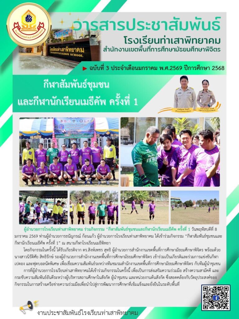 วันพฤหัสบดีที่ 8 มกราคม 2569 ท่านผู้อำนวยการธนัญกรณ์ ก้อนแก้ว ผู้อำนวยการโรงเรียนท่าเสาพิทยาคม ได้เข้าร่วมกิจกรรม “กีฬาสัมพันธ์ชุมชนและกีฬานักเรียนเมธีคัพ ครั้งที่ 1” ณ สนามกีฬาโรงเรียนเมธีพิทยา ครับ