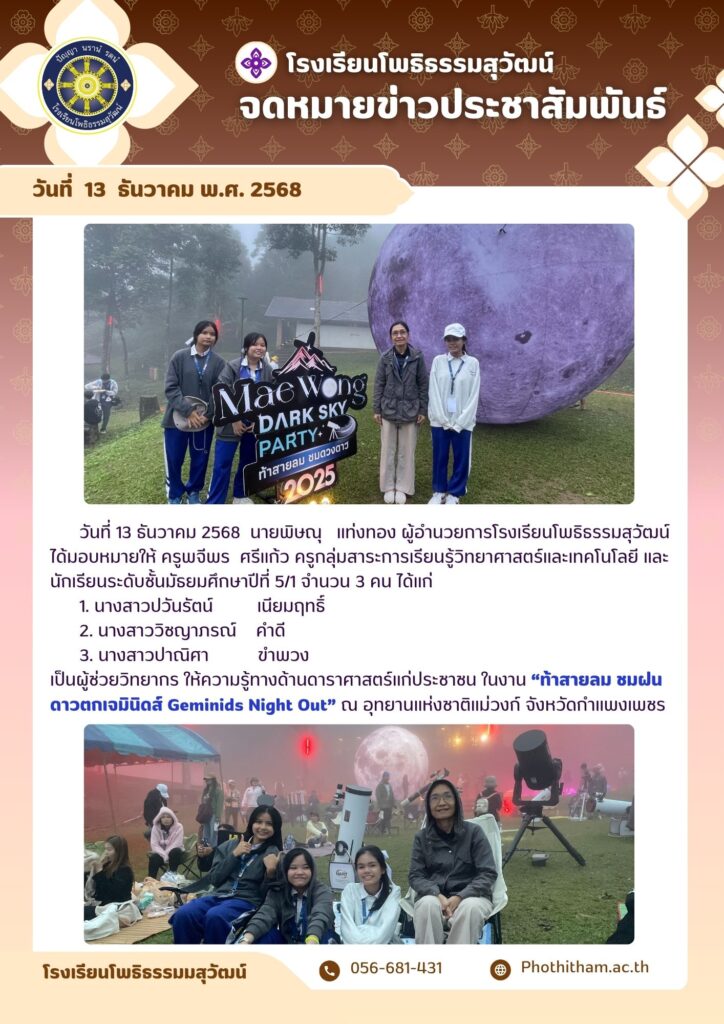 “ท้าสายลม ชมฝนดาวตกเจมินิดส์ Geminids Night Out” ณ อุทยานแห่งชาติแม่วงก์ จังหวัดกำแพงเพชรBy โรงเรียนโพธิธรรมสุวัฒน์ / 24/12/2025