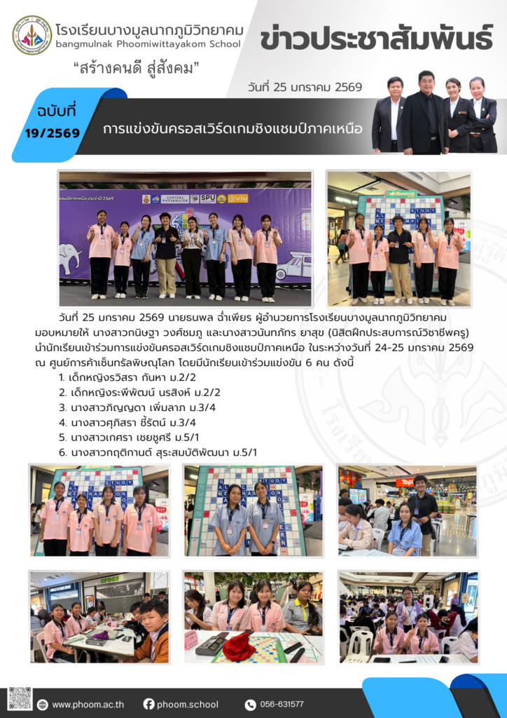 นักเรียนเข้าร่วมการแข่งขันครอสเวิร์ดเกมชิงแชมป์ภาคเหนือ ในระหว่างวันที่ 24-25 มกราคม 2569 ณ ศูนย์การค้าเซ็นทรัลพิษณุโลกBy โรงเรียนบางมูลนากภูมิวิทยาคม / 06/02/2026