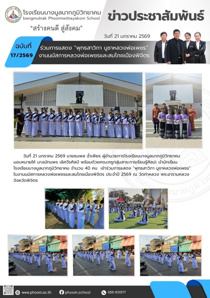 นักเรียนโรงเรียนบางมูลนากภูมิวิทยาคม จำนวน 40 คน เข้าร่วมการแสดง “พุทธสาวิกา บูชาหลวงพ่อเพชร” ในงานนมัสการหลวงพ่อเพชรและสมโภชเมืองพิจิตร ประจำปี 2569 ณ วัดท่าหลวง พระอารามหลวง จังหวัดพิจิตรBy โรงเรียนบางมูลนากภูมิวิทยาคม / 22/01/2026