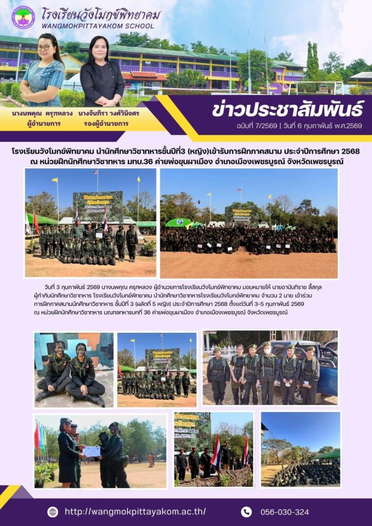 วันที่ 3 กุมภาพันธ์ 2569 นางนพคุณ ครุฑหลวง ผู้อำนวยการโรงเรียนวังโมกข์พิทยาคม มอบหมายให้ นายอานันทิราช ลี้สกุล ผู้กำกับนักศึกษาวิชาทหาร โรงเรียนวังโมกข์พิทยาคม นำนักศึกษาวิชาทหารโรงเรียนวังโมกข์พิทยาคม จำนวน 2 นาย เข้าร่วม การฝึกภาคสนามนักศึกษาวิชาทหาร ชั้นปีที่ 3 (ผลัดที่ 5 หญิง) ประจำปีการศึกษา 2568 ตั้งแต่วันที่ 3-5 กุมภาพันธ์ 2569 ณ หน่วยฝึกนักศึกษาวิชาทหาร มณฑลทหารบกที่ 36 ค่ายพ่อขุนผาเมือง อำเภอเมืองเพชรบูรณ์ จังหวัดเพชรบูรณ์