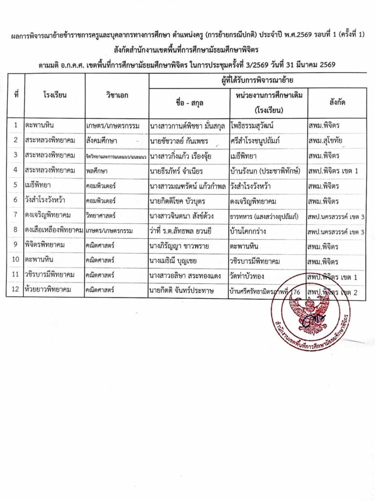 ประกาศ อ.ก.ค.ศ. เขตพื้นที่การศึกษามัธยมศึกษาพิจิตร เรื่อง ย้ายข้าราชการครูเเละบุคลากรทางการศึกษา ตำเเหน่งครู (การย้ายกรณีปกติ) ประจำปี พ.ศ. 2569 รอบที่ 1 (ครั้งที่ 1) สังกัดสำนักงานเขตพื้นที่การศึกษามัํยมศึกษาพิจิตร