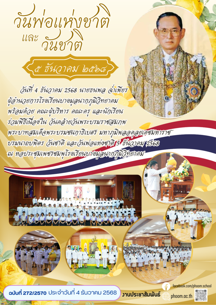 พิธีเนื่องใน วันคล้ายวันพระบรมราชสมภพ พระบาทสมเด็จพระบรมชนกาธิเบศร มหาภูมิพลอดุลยเดชมหาราช บรมนาถบพิตร วันชาติ และวันพ่อแห่งชาติ 5 ธันวาคม 2568By โรงเรียนบางมูลนากภูมิวิทยาคม / 04/12/2025