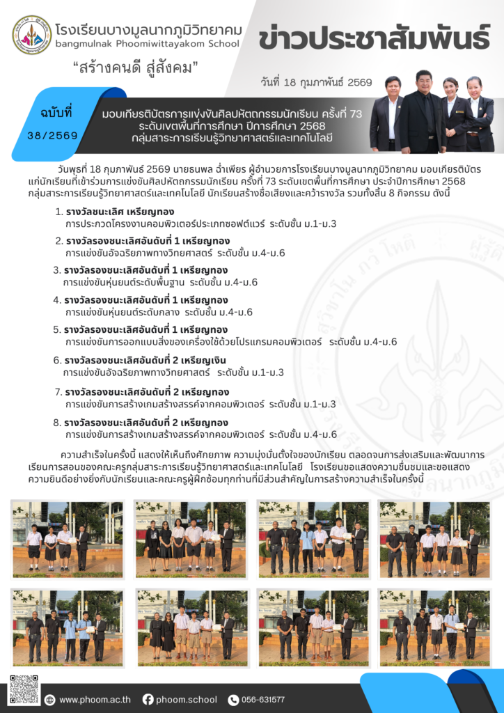 มอบเกียรติบัตรการแข่งขันศิลปหัตถกรรมนักเรียน ครั้งที่ 73 ระดับเขตพื้นที่การศึกษา ปีการศึกษา 2568 กลุ่มสาระการเรียนรู้วิทยาศาสตร์และเทคโนโลยีBy โรงเรียนบางมูลนากภูมิวิทยาคม / 06/03/2026