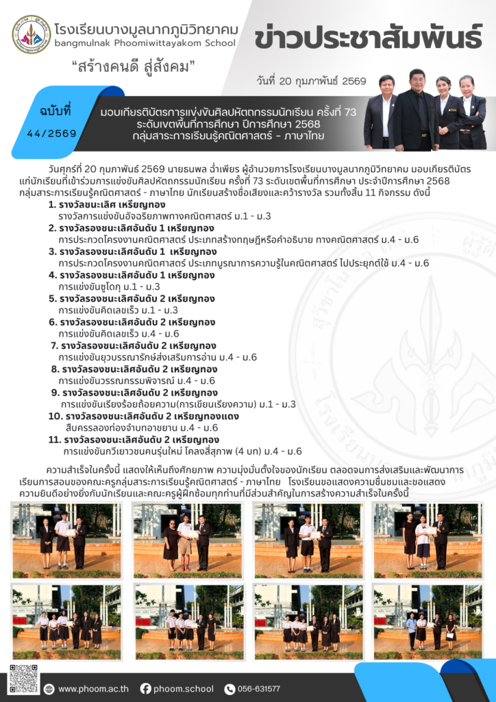 มอบเกียรติบัตรการแข่งขันศิลปหัตถกรรมนักเรียน ครั้งที่ 73 ระดับเขตพื้นที่การศึกษา ปีการศึกษา 2568 กลุ่มสาระการเรียนรู้คณิตศาสตร์ – ภาษาไทยBy โรงเรียนบางมูลนากภูมิวิทยาคม / 06/03/2026
