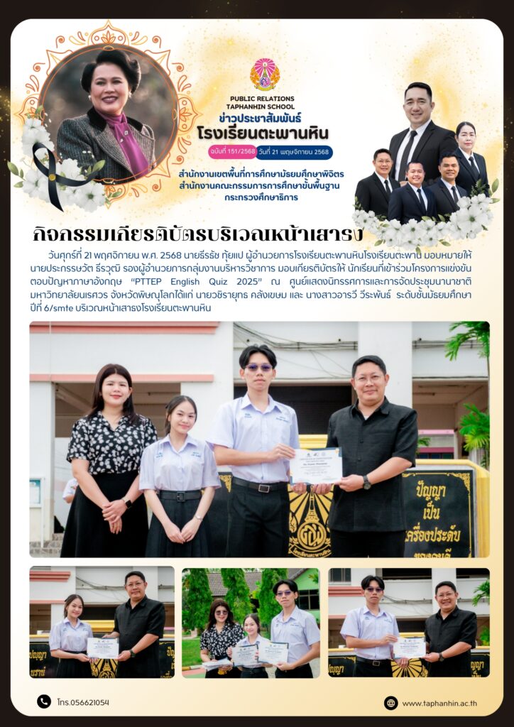 มอบเกียรติบัตรให้ นักเรียนที่เข้าร่วมโครงการแข่งขัน ตอบปัญหาภาษาอังกฤษ “PTTEP English Quiz 2025” ณ ศูนย์แสดงนิทรรศการและการจัดประชุมนานาชาติ มหาวิทยาลัยนเรศวร จังหวัดพิษณุโลกBy โรงเรียนตะพานหิน / 28/11/2025