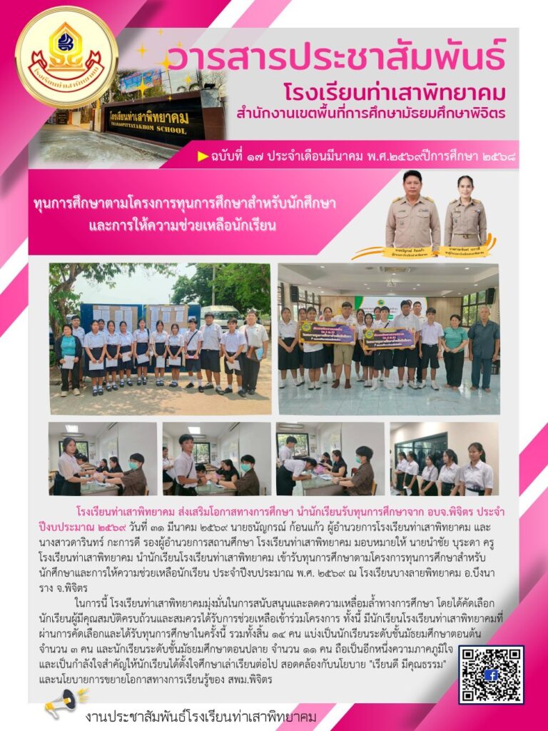 วันที่ 31 มีนาคม 2569 นายธนัญกรณ์ ก้อนแก้ว ผู้อำนวยการโรงเรียนท่าเสาพิทยาคม และนางสาวดารินทร์ กะการดี รองผู้อำนวยการสถานศึกษา โรงเรียนท่าเสาพิทยาคม มอบหมายให้ นายนำชัย บุระดา ครูโรงเรียนท่าเสาพิทยาคม นำน้องๆ นักเรียน เข้ารับทุนการศึกษาตามโครงการทุนการศึกษาสำหรับนักศึกษาและการให้ความช่วยเหลือนักเรียน ประจำปีงบประมาณ พ.ศ. 2569 จัดโดยองค์การบริหารส่วนจังหวัดพิจิตร ณ อาคารเอนกประสงค์เทศบาลเมืองตะพานหิน ค่ะ ![]()