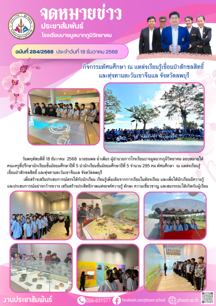 วันที่ 18 ธันวาคม 2568 นายธนพลฉ่ำเพียรผู้อำนวยการโรงเรียนบางมูลนากภูมิวิทยาคมมอบหมายให้คณะครูที่ปรึกษานักเรียนชั้นมัธยมศึกษาปีที่ 5 นำนักเรียนชั้นมัธยมศึกษาปีที่ 5 จำนวน 295 คนทัศนศึกษาณแหล่งเรียนรู้เขื่อนป่าสักชลสิทธิ์และทุ่งทานตะวันเขาจีนแลจังหวัดลพบุรี