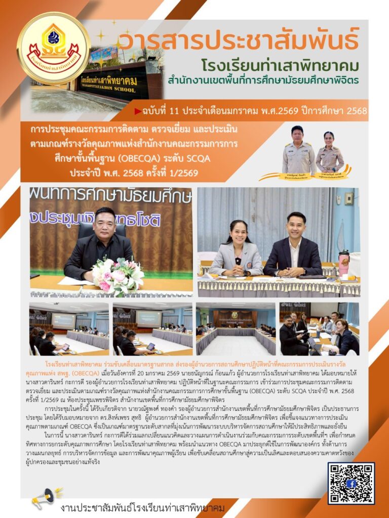 วันจันทร์ที่ 20 มกราคม 2569 ท่านผู้อำนวยการธนัญกรณ์ ก้อนแก้ว มอบหมายให้ นางสาวดารินทร์ กะการดี รองผู้อำนวยการโรงเรียนท่าเสาพิทยาคม เป็นตัวแทนสถานศึกษาเข้าร่วมประชุมในฐานะ “คณะกรรมการติดตาม ตรวจเยี่ยม และประเมินรางวัลคุณภาพแห่ง สพฐ. (OBECQA)” ระดับ SCQA ประจำปี 2568 ณ สพม.พิจิตร