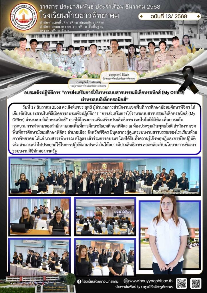 วันที่ 17 ธันวาคม 2568 ดร.สิงห์เพชร สุทธิ ผู้อำนวยการสำนักงานเขตพื้นที่การศึกษามัธยมศึกษาพิจิตร ให้เกียรติเป็นประธานในพิธีเปิดการอบรมเชิงปฏิบัติการ “การส่งเสริมการใช้งานระบบสารบรรณอิเล็กทรอนิกส์ (My Office) ผ่านระบบอิเล็กทรอนิกส์” ภายใต้โครงการเสริมสร้างประสิทธิภาพ เทคโนโลยีดิจิทัล เพื่อยกระดับกระบวนการทำงานของสำนักงานเขตพื้นที่การศึกษามัธยมศึกษาพิจิตร ณ ห้องประชุมเงินพุทธโชติ สำนักงานเขตพื้นที่การศึกษามัธยมศึกษาพิจิตร อำเภอเมือง จังหวัดพิจิตร มีบุคลากรผู้ดูแลระบบงานสารบรรณของโรงเรียนห้วยยาวพิทยาคม ได้แก่ นางสาวรพีพรรณ ศรีภูธร เข้าร่วมการอบรมฯ โดยได้รับทั้งความรู้เชิงทฤษฎีและการฝึกปฏิบัติจริง สามารถนำไปประยุกต์ใช้ในการปฏิบัติงานประจำวันได้อย่างมีประสิทธิภาพ สอดคล้องกับนโยบายการพัฒนาระบบงานดิจิทัลของภาครัฐ