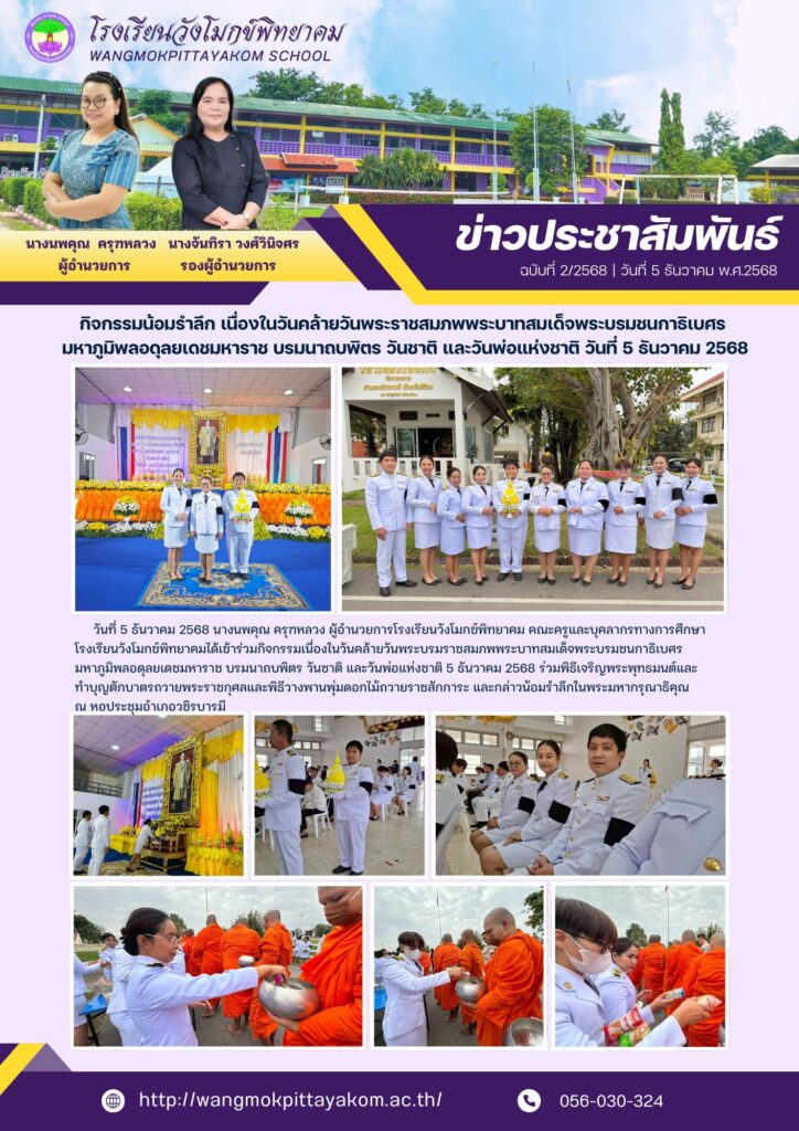 วันที่ 5 ธันวาคม 2568 นางนพคุณ ครุฑหลวง ผู้อำนวยการโรงเรียนวังโมกข์พิทยาคม คณะครูและบุคลากรทางการศึกษา โรงเรียนวังโมกข์พิทยาคมได้เข้าร่วมกิจกรรมเนื่องในวันคล้ายวันพระบรมราชสมภพพระบาทสมเด็จพระบรมชนกาธิเบศรมหาภูมิพลอดุลยเดชมหาราช บรมนาถบพิตร วันชาติ และวันพ่อแห่งชาติ 5 ธันวาคม 2568 ร่วมพิธีเจริญพระพุทธมนต์และทำบุญตักบาตรถวายพระราชกุศลและพิธีวางพานพุ่มดอกไม้ถวายราชสักการะ และกล่าวน้อมรำลึกในพระมหากรุณาธิคุณ ณ หอประชุมอำเภอวชิรบารมี