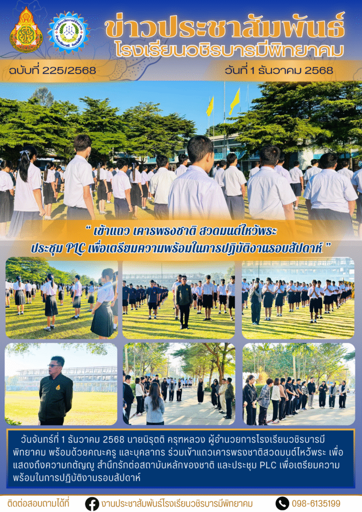 วันจันทร์ที่ 1 ธันวาคม 2568 นายนิรุตติ ครุฑหลวง ผู้อำนวยการโรงเรียนวชิรบารมีพิทยาคม พร้อมด้วยคณะครู และบุคลากร ร่วมเข้าแถวเคารพธงชาติสวดมนต์ไหว้พระ เพื่อแสดงถึงความกตัญญู สำนึกรักต่อสถาบันหลักของชาติ และประชุม PLC เพื่อเตรียมความพร้อมในการปฏิบัติงานรอบสัปดาห์