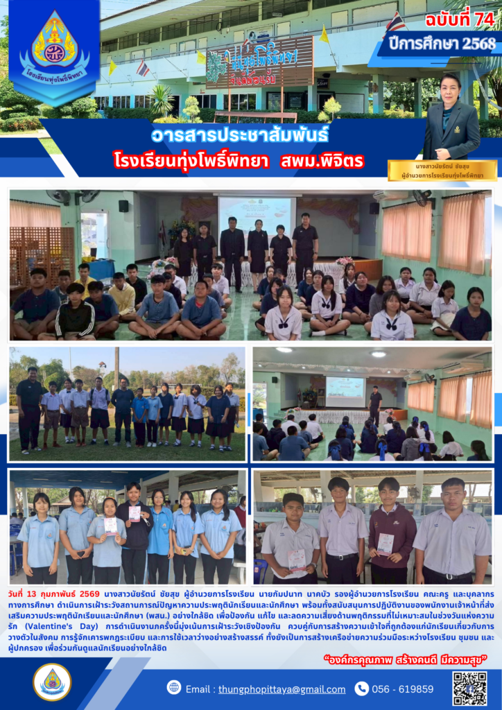 วันที่ 13 กุมภาพันธ์ 2569 นางสาวนัยรัตน์ ชัยสุข ผู้อำนวยการโรงเรียน นายกัมปนาท นาคบัว รองผู้อำนวยการโรงเรียน คณะครู และบุคลากรทางการศึกษา ดำเนินการเฝ้าระวังสถานการณ์ปัญหาความประพฤตินักเรียนและนักศึกษา พร้อมทั้งสนับสนุนการปฏิบัติงานของพนักงานเจ้าหน้าที่ส่งเสริมความประพฤตินักเรียนและนักศึกษา (พสน.) อย่างใกล้ชิด เพื่อป้องกัน แก้ไข และลดความเสี่ยงด้านพฤติกรรมที่ไม่เหมาะสมในช่วงวันแห่งความรัก (Valentine’s Day) การดำเนินงานภครั้งนี้มุ่งเน้นการเฝ้าระวังเชิงป้องกัน ควบคู่กับการสร้างความเข้าใจที่ถูกต้องแก่นักเรียนเกี่ยวกับการวางตัวในสังคม การรู้จักเคารพกฎระเบียบ และการใช้เวลาว่างอย่างสร้างสรรค์ ทั้งยังเป็นการสร้างเครือข่ายความร่วมมือระหว่างโรงเรียน ชุมชน และผู้ปกครอง เพื่อร่วมกันดูแลนักเรียนอย่างใกล้ชิด