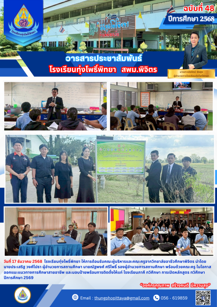 วันที่ 17 ธันวาคม 2568 โรงเรียนทุ่งโพธิ์พิทยา ให้การต้อนรับคณะผู้บริหารและคณะครูจากวิทยาลัยอาชีวศึกษาพิจิตร นำโดย นายประเสริฐ วงศ์โปธา ผู้อำนวยการสถานศึกษา นายณัฐพงศ์ ศรีโพธิ์ รองผู้อำนวยการสถานศึกษา พร้อมด้วยคณะครู ในโอกาสออกแนะแนวทางการศึกษาสายอาชีพ และมอบป้ายพร้อมการติดตั้งให้แก่ โรงเรียนภาคี ทวิศึกษา การเปิดหลักสูตร ทวิศึกษา ปีการศึกษา 2569