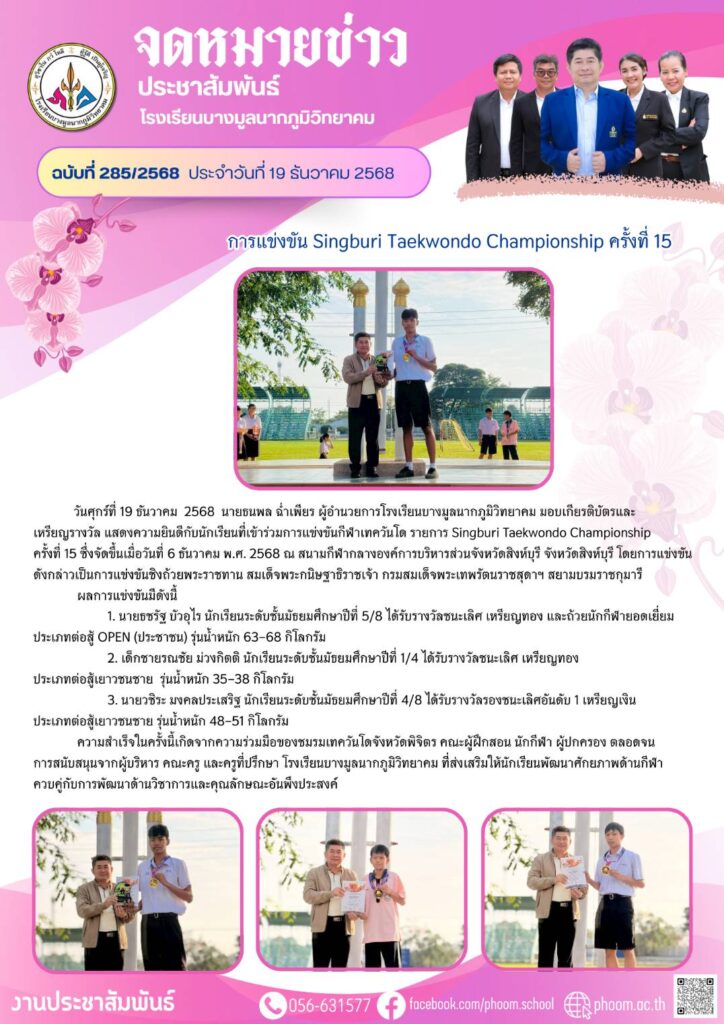 แสดงความยินดีกับนักเรียนที่เข้าร่วมการแข่งขันกีฬาเทควันโด รายการ Singburi Taekwondo Championship