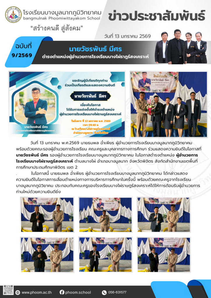 แสดงความยินดีในโอกาสที่ นายวัชรพันธ์ มีศร รองผู้อำนวยการโรงเรียนบางมูลนากภูมิวิทยาคม ในโอกาสดำรงตำแหน่ง ผู้อำนวยการโรงเรียนบางไผ่ราษฎร์สงเคราะห์ ตำบลบางไผ่ อำเภอบางมูลนาก จังหวัดพิจิตร สังกัดสำนักงานเขตพื้นที่การศึกษาประถมศึกษาพิจิตร เขต 2