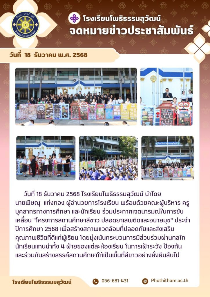 “โครงการสถานศึกษาสีขาว ปลอดยาเสพติดและอบายมุข” ประจำปีการศึกษา 2568 เพื่อสร้างสภาพแวดล้อมที่ปลอดภัยและส่งเสริมคุณภาพชีวิตที่ดีแก่ผู้เรียนBy โรงเรียนโพธิธรรมสุวัฒน์ / 24/12/2025
