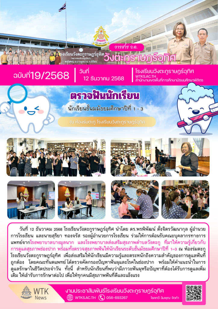 โรงพยาบาลบางมูลนาก และโรงพยาบาลส่งเสริมสุขภาพตำบลวังตะกู ให้ความรู้เกี่ยวกับการดูแลสุขภาพช่องปาก พร้อมทั้งตรวจสุขภาพฟันให้นักเรียนระดับชั้นมัธยมศึกษาปีที่ 1–3By โรงเรียนวังตะกูราษฎร์อุทิศ / 12/12/2025