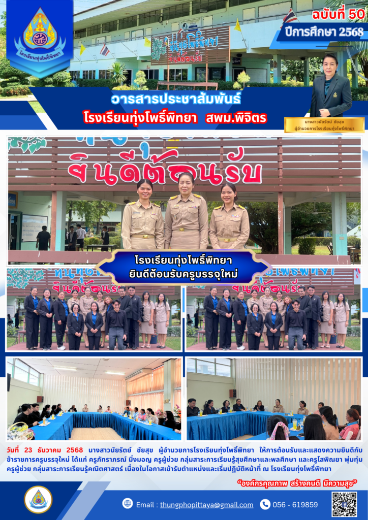 วันที่ 23 ธันวาคม 2568 นางสาวนัยรัตย์ ชัยสุข ผู้อำนวยการโรงเรียนทุ่งโพธิ์พิทยา ให้การต้อนรับและแสดงความยินดีกับข้าราชการครูบรรจุใหม่ ได้แก่ ครูภัทราภรณ์ มิ่งมอญ ครูผู้ช่วย กลุ่มสาระการเรียนรู้สุขศึกษาและพลศึกษา และครูโสพิณยา พุ่มทุ่ม ครูผู้ช่วย กลุ่มสาระการเรียนรู้คณิตศาสตร์ เนื่องในโอกาสเข้ารับตำแหน่งและเริ่มปฏิบัติหน้าที่ ณ โรงเรียนทุ่งโพธิ์พิทยา