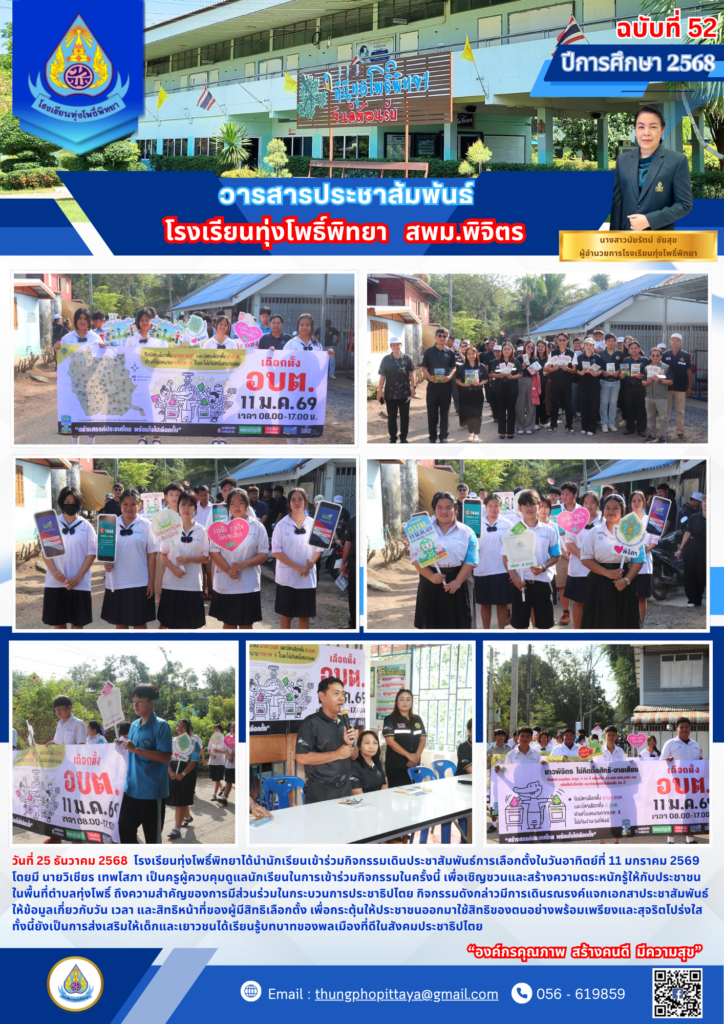 วันที่ 25 ธันวาคม 2568 โรงเรียนทุ่งโพธิ์พิทยาได้นำนักเรียนเข้าร่วมกิจกรรมเดินประชาสัมพันธ์การเลือกตั้งในวันอาทิตย์ที่ 11 มกราคม 2569 โดยมี นายวิเชียร เทพโสภา เป็นครูผู้ควบคุมดูแลนักเรียนในการเข้าร่วมกิจกรรมในครั้งนี้ เพื่อเชิญชวนและสร้างความตระหนักรู้ให้กับประชาชนในพื้นที่ตำบลทุ่งโพธิ์ถึงความสำคัญของการมีส่วนร่วมในกระบวนการประชาธิปไตย กิจกรรมดังกล่าวมีการเดินรณรงค์แจกเอกสาประชาสัมพันธ์ ให้ข้อมูลเกี่ยวกับวัน เวลา และสิทธิหน้าที่ของผู้มีสิทธิเลือกตั้ง เพื่อกระตุ้นให้ประชาชนออกมาใช้สิทธิของตนอย่างพร้อมเพรียงและสุจริตโปร่งใส ทั้งนี้ยังเป็นการส่งเสริมให้เด็กและเยาวชนได้เรียนรู้บทบาทของพลเมืองที่ดีในสังคมประชาธิปไตย