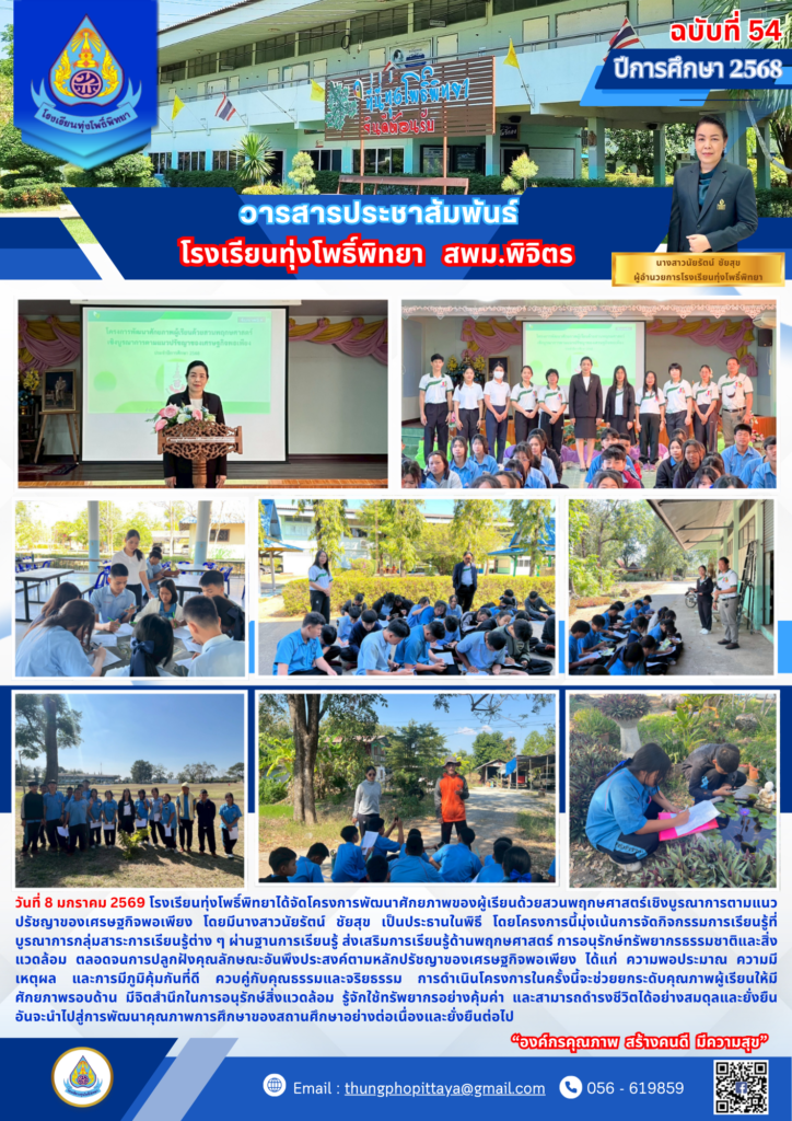 วันที่ 8 มกราคม 2569 โรงเรียนทุ่งโพธิ์พิทยาได้จัดโครงการพัฒนาศักยภาพของผู้เรียนด้วยสวนพฤกษศาสตร์เชิงบูรณาการตามแนวปรัชญาของเศรษฐกิจพอเพียง โดยมีนางสาวนัยรัตน์ ชัยสุข เป็นประธานในพิธี โดยโครงการนี้มุ่งเน้นการจัดกิจกรรมการเรียนรู้ที่บูรณาการกลุ่มสาระการเรียนรู้ต่าง ๆ ผ่านฐานการเรียนรู้ ส่งเสริมการเรียนรู้ด้านพฤกษศาสตร์ การอนุรักษ์ทรัพยากรธรรมชาติและสิ่งแวดล้อม ตลอดจนการปลูกฝังคุณลักษณะอันพึงประสงค์ตามหลักปรัชญาของเศรษฐกิจพอเพียง ได้แก่ ความพอประมาณ ความมีเหตุผล และการมีภูมิคุ้มกันที่ดี ควบคู่กับคุณธรรมและจริยธรรม การดำเนินโครงการในครั้งนี้จะช่วยยกระดับคุณภาพผู้เรียนให้มีศักยภาพรอบด้าน มีจิตสำนึกในการอนุรักษ์สิ่งแวดล้อม รู้จักใช้ทรัพยากรอย่างคุ้มค่า และสามารถดำรงชีวิตได้อย่างสมดุลและยั่งยืน อันจะนำไปสู่การพัฒนาคุณภาพการศึกษาของสถานศึกษาอย่างต่อเนื่องและยั่งยืนต่อไป