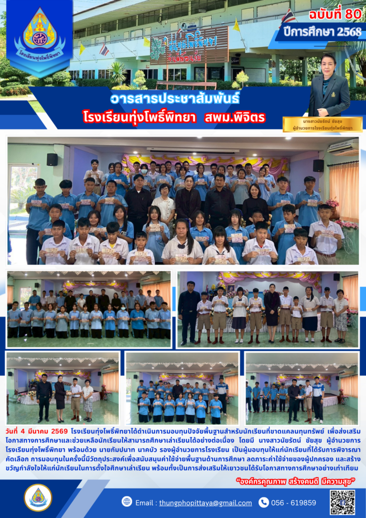 วันที่ 4 มีนาคม 2569 โรงเรียนทุ่งโพธิ์พิทยาได้ดำเนินการมอบทุนปัจจัยพื้นฐานสำหรับนักเรียนที่ขาดแคลนทุนทรัพย์ เพื่อส่งเสริมโอกาสทางการศึกษาและช่วยเหลือนักเรียนให้สามารถศึกษาเล่าเรียนได้อย่างต่อเนื่อง โดยมี นางสาวนัยรัตน์ ชัยสุข ผู้อำนวยการโรงเรียนทุ่งโพธิ์พิทยา พร้อมด้วย นายกัมปนาท นาคบัว รองผู้อำนวยการโรงเรียน เป็นผู้มอบทุนให้แก่นักเรียนที่ได้รับการพิจารณาคัดเลือก การมอบทุนในครั้งนี้มีวัตถุประสงค์เพื่อสนับสนุนค่าใช้จ่ายพื้นฐานด้านการศึกษา ลดภาระค่าใช้จ่ายของผู้ปกครอง และสร้างขวัญกำลังใจให้แก่นักเรียนในการตั้งใจศึกษาเล่าเรียน พร้อมทั้งเป็นการส่งเสริมให้เยาวชนได้รับโอกาสทางการศึกษาอย่างเท่าเทียม