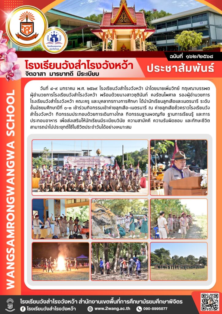 โรงเรียนวังสำโรงวังหว้า ได้จัดกิจกรรมเข้าค่ายลูกเสือ–เนตรนารี ระหว่างวันที่ ๘–๙ มกราคม พุทธศักราช ๒๕๖๙ ณ ค่ายลูกเสือชั่วคราวโรงเรียนวังสำโรงวังหว้าBy pr1066350383 / 14/01/2026